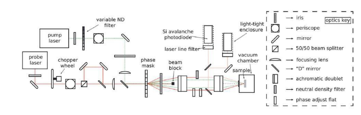 In the context of quench detection systems for fusion superconducting magnets, temperature sensors based on optical fibers provide an effective solution for rapid, distributed measurement, with low sensitivity to electromagnetic interference. At the cryogenic temperatures and high radiation doses associated with this application, however, optical fibers undergo radiation-induced attenuation (RIA): light-absorbing point defects form within the silica glass structure, reducing the longevity and effectiveness of these sensors. This project follows research performed in the MNM group on the characterization of these defects and their build-up and annealing kinetics at cryogenic temperatures under gamma irradiation. Transient grating spectroscopy (TGS) enables the measurement of both thermal diffusivity and sound speed in a bulk material sample. Surface acoustic waves (SAWs) and a well-defined temperature grating are generated by interference of two short excitation laser beams, and the diffraction of a second laser is used to probe their decay. Figure 1 represents the spectroscopy system.
