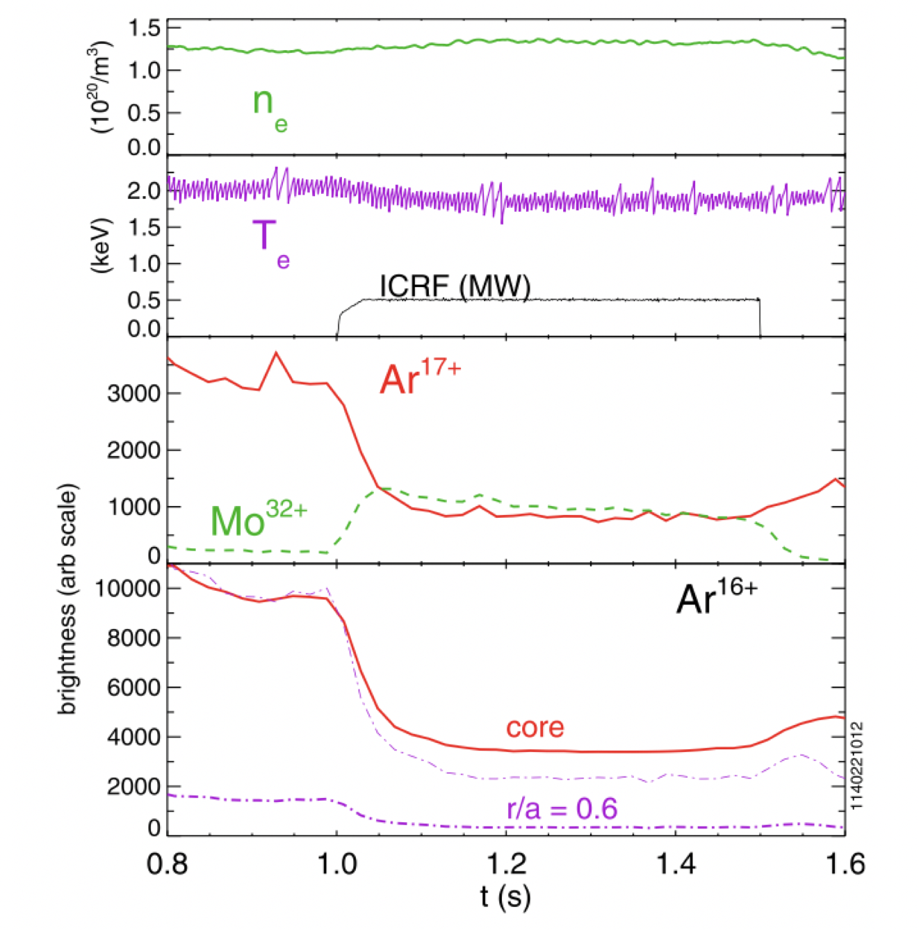 Figure: Observed spectroscopic signal from argon charge states (bottom two panels, red & purple lines) when the Ion Cyclotron Range of Frequencies (ICRF) heating is energized (2nd panel, black line) in plasmas with substantial hydrogen-to-deuterium re