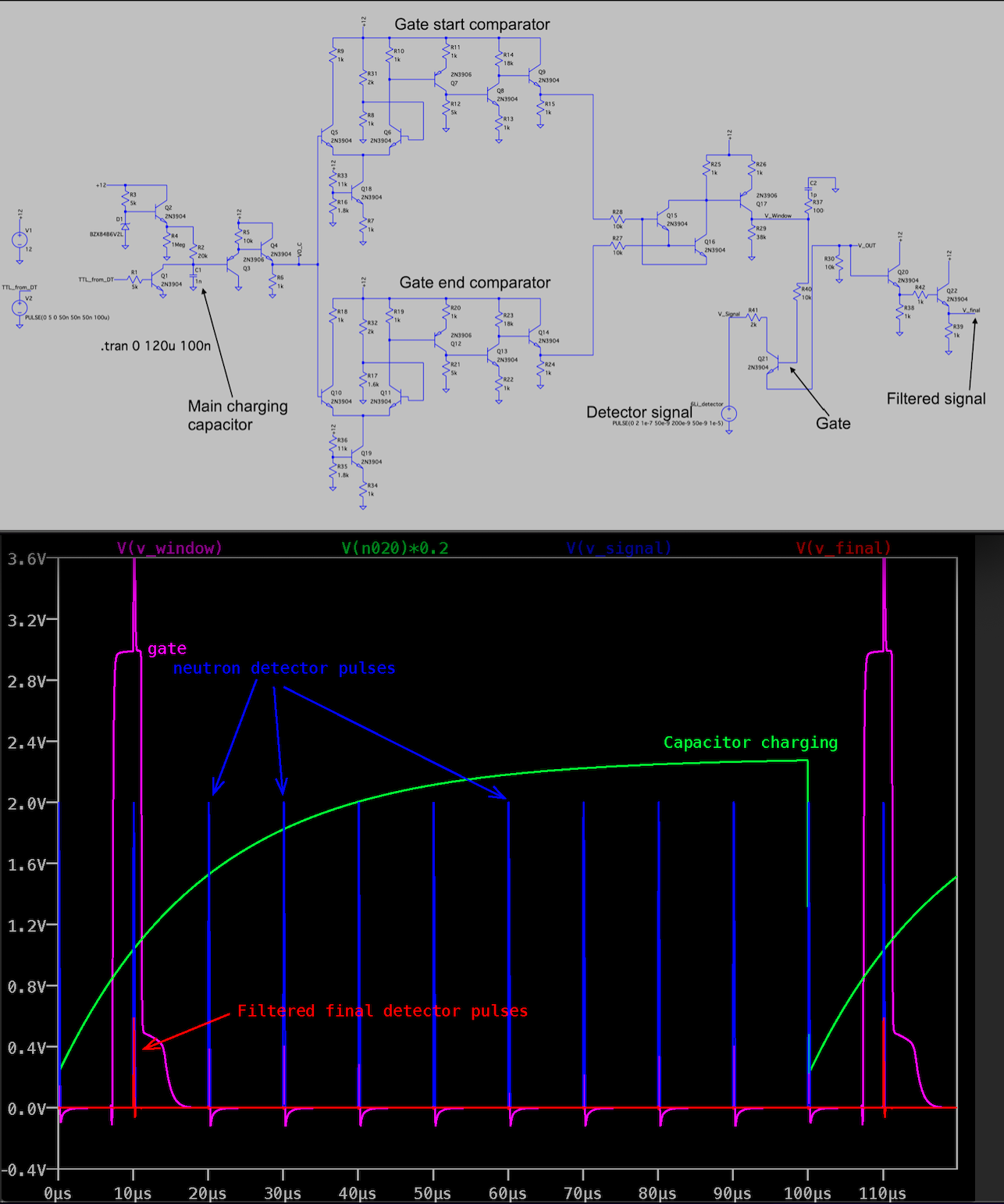 The simplest way of achieving this, using analog devices, is to switch from time domain to voltage domain using a simple charging capacitor in RC configuration. See the top figure for the circuit layout of the proposed system. Here the DT generates the t0, which starts the charging of the capacitor. Preliminary circuit design has been performed -- the circuit has been simulated in LTspice as well as breadboard-level circuitry. The bottom figure shows the evolution of the detector signal, as it passes through the filtering gate. The filtered signal (red) shows suppression of all pulses which do not fall into the gate. This filtered signal can then be used to either trigger a mechanical analog counter, or be fed into an analog-circuit based ripple counter.